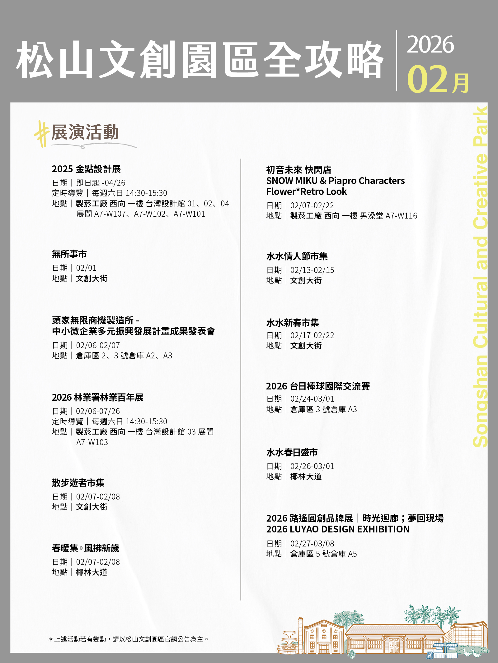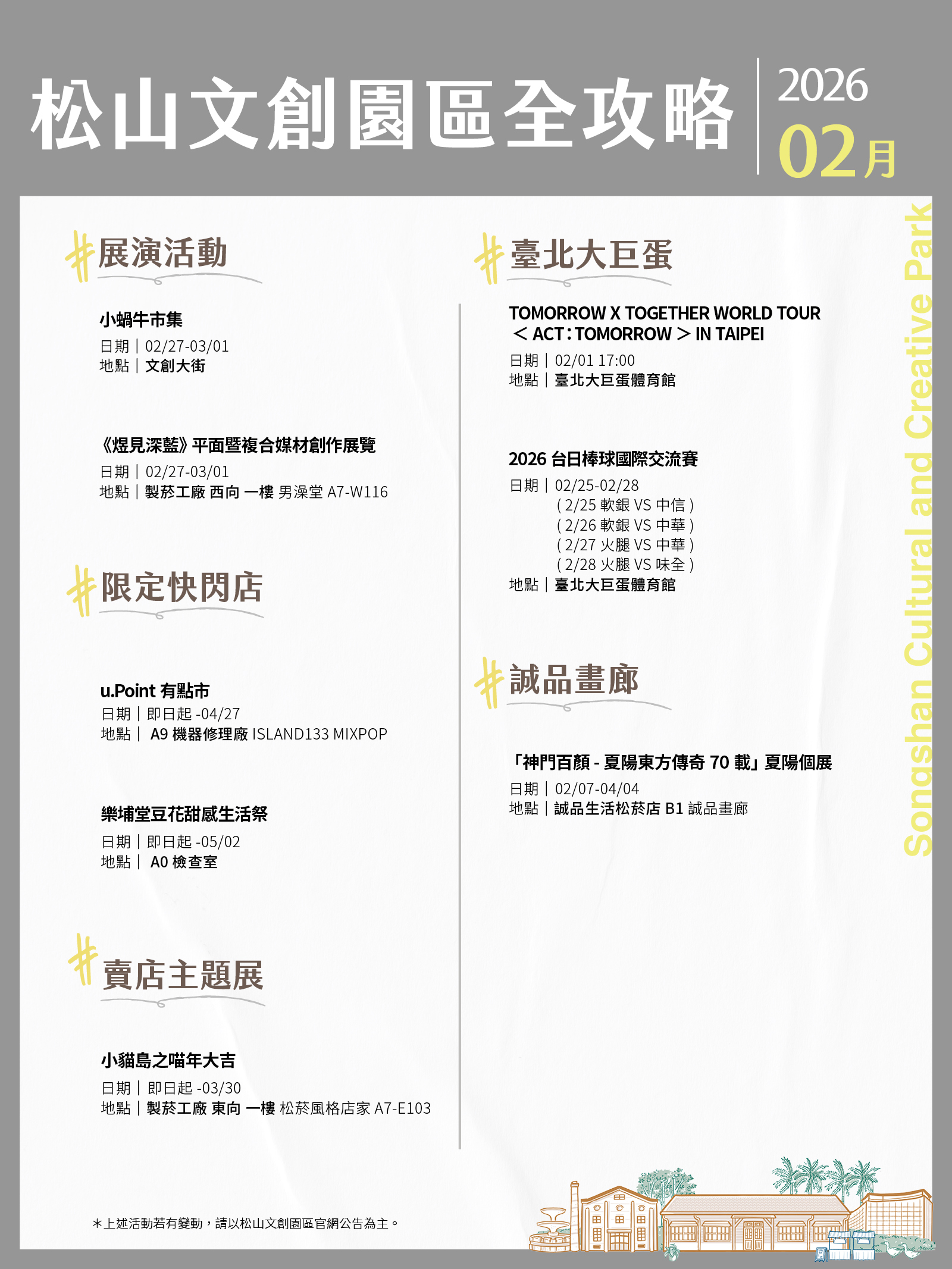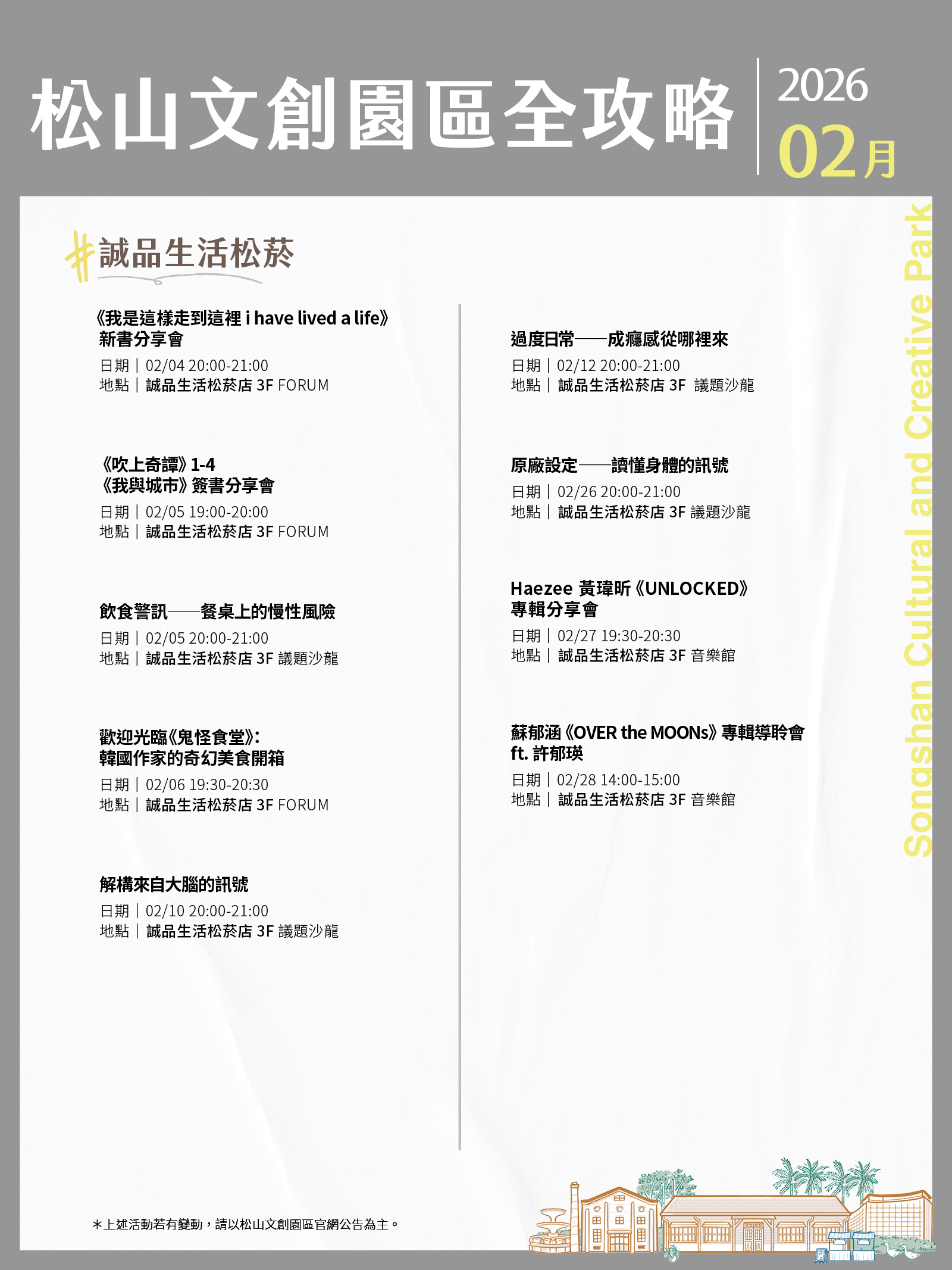 松山文創園區、臺北大巨蛋、臺北文創、誠品生活松菸2月活動攻略都在這!