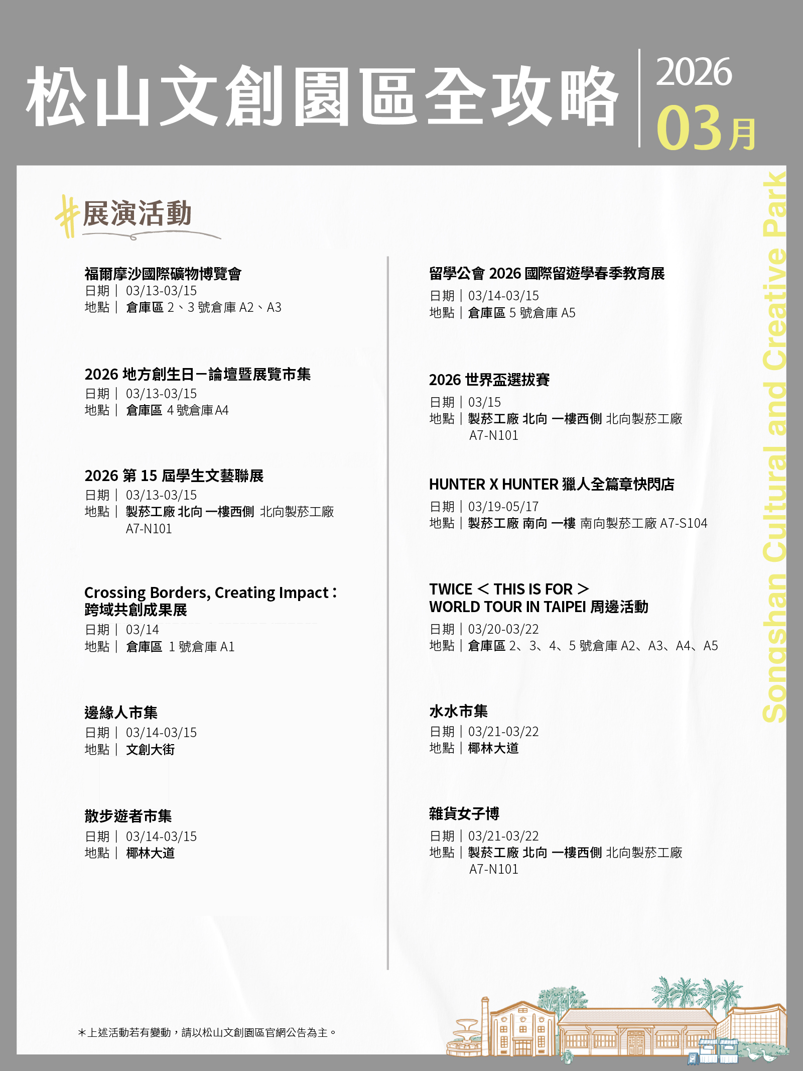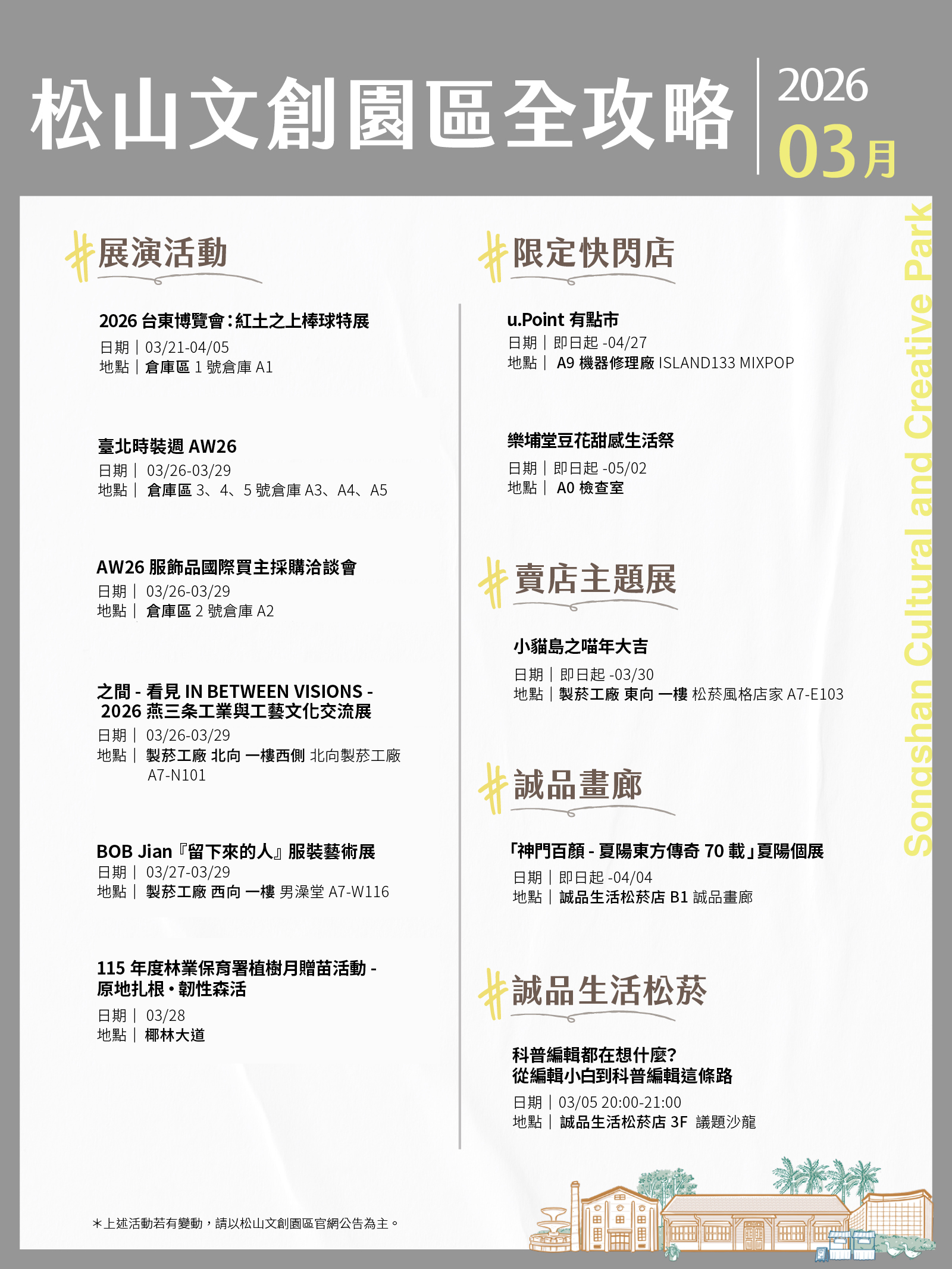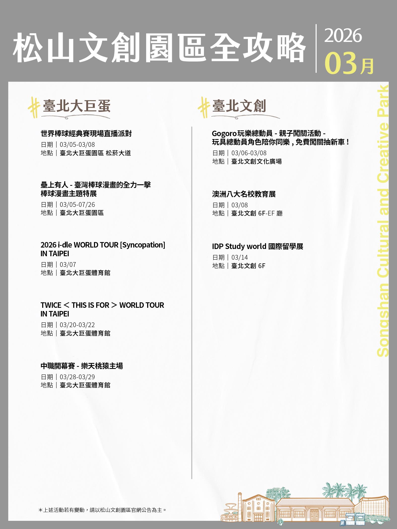 松山文創園區、臺北大巨蛋、臺北文創、誠品生活松菸3月活動攻略都在這!