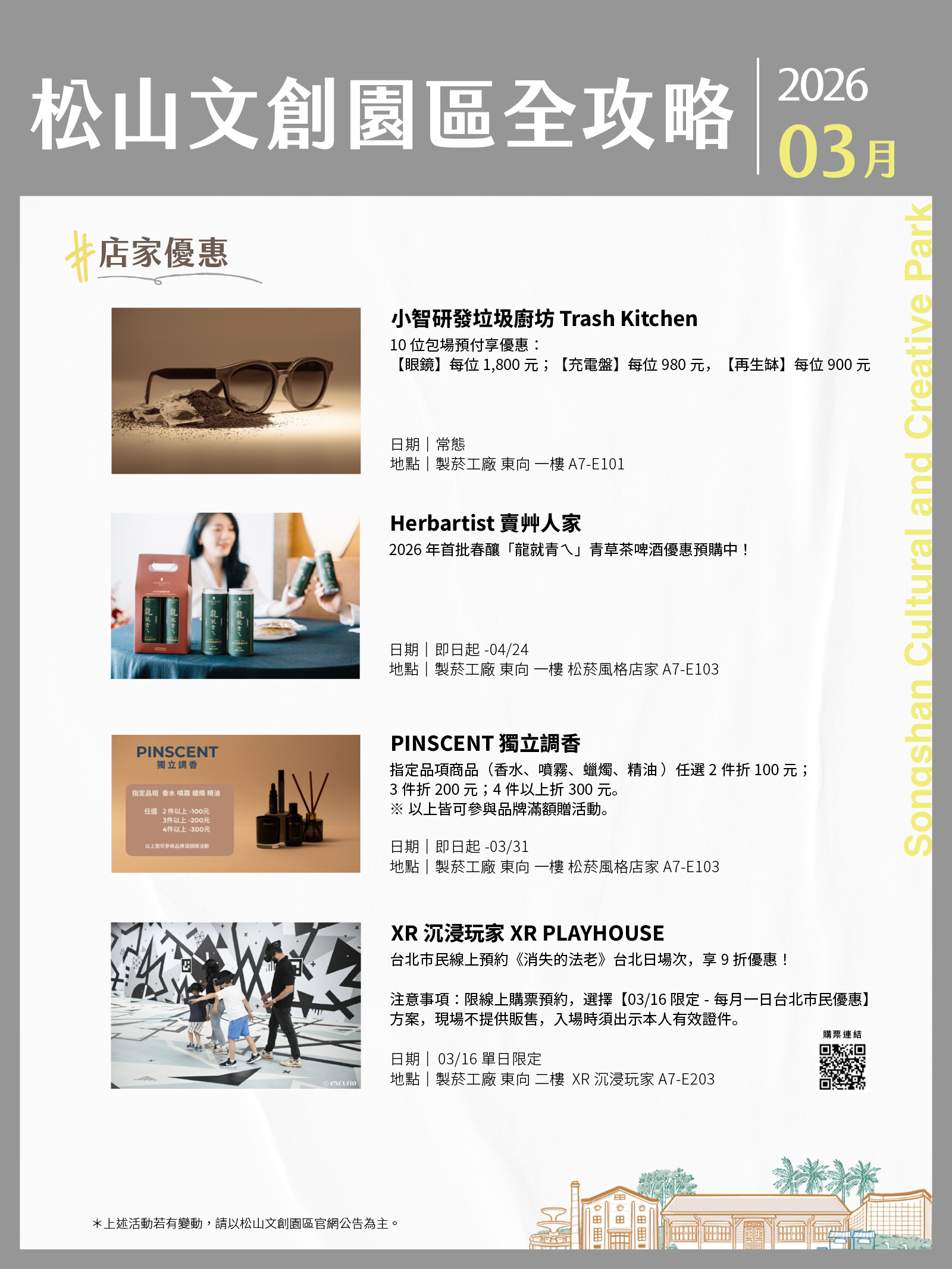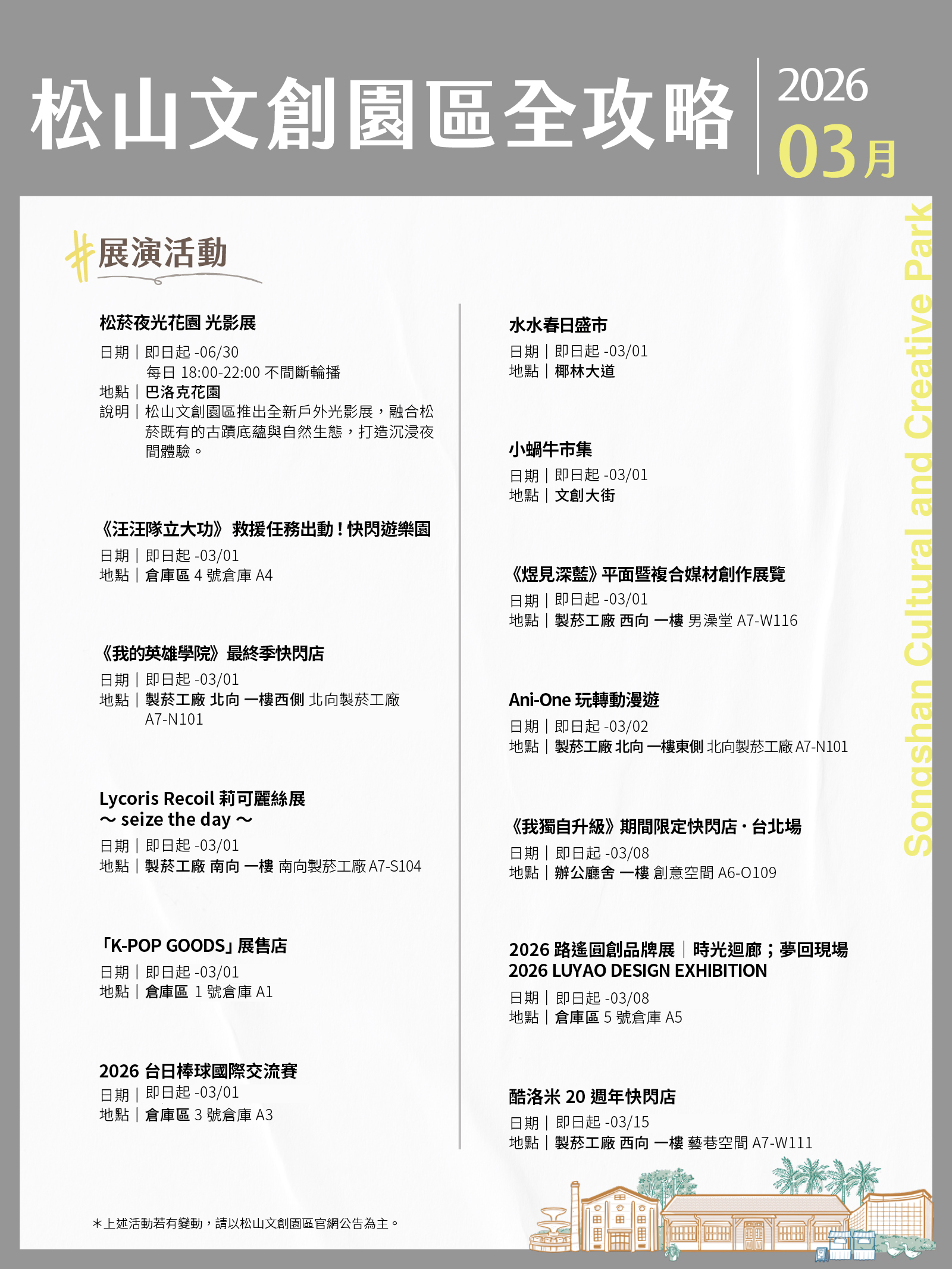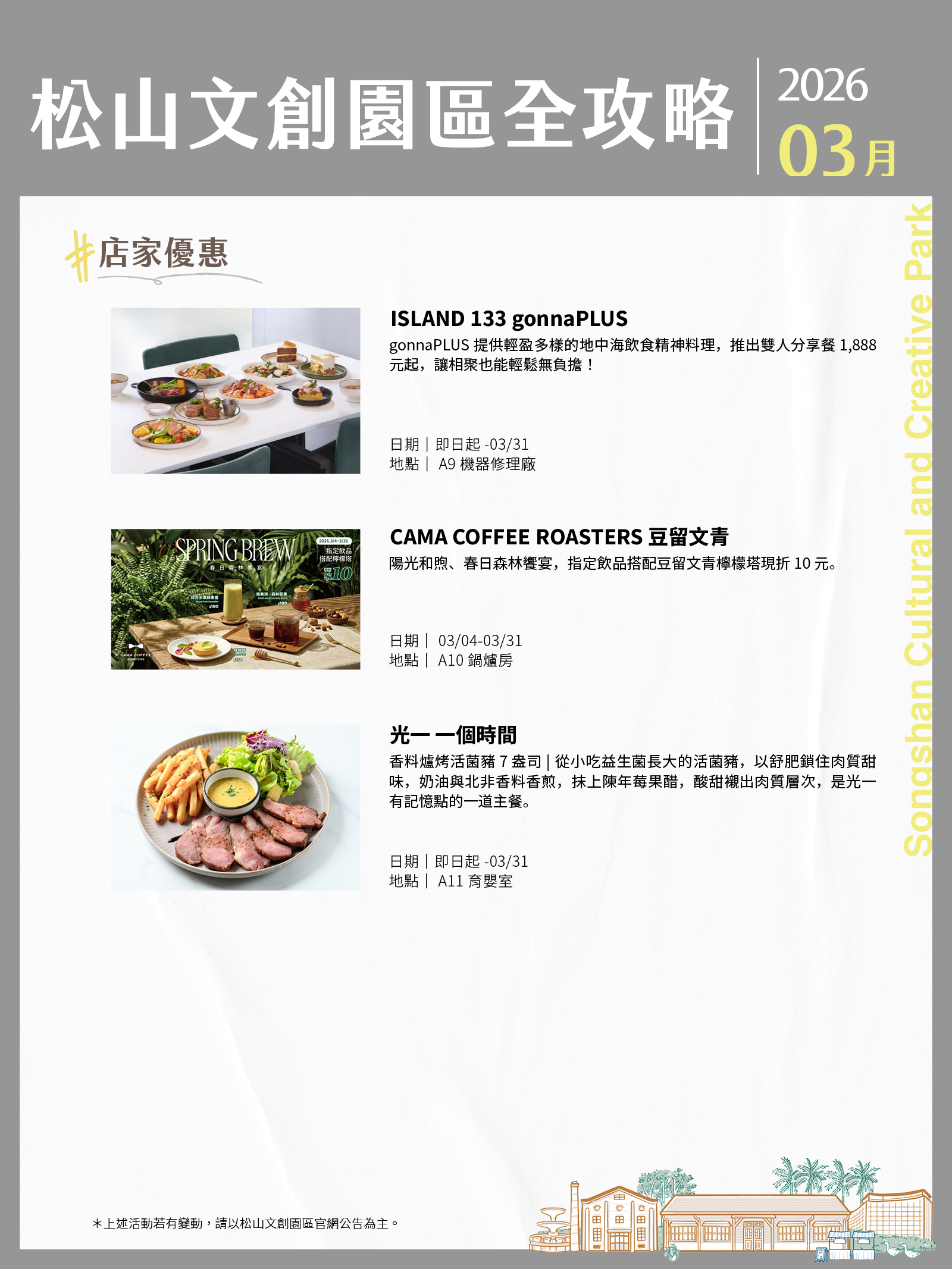松山文創園區、臺北大巨蛋、臺北文創、誠品生活松菸3月活動攻略都在這!