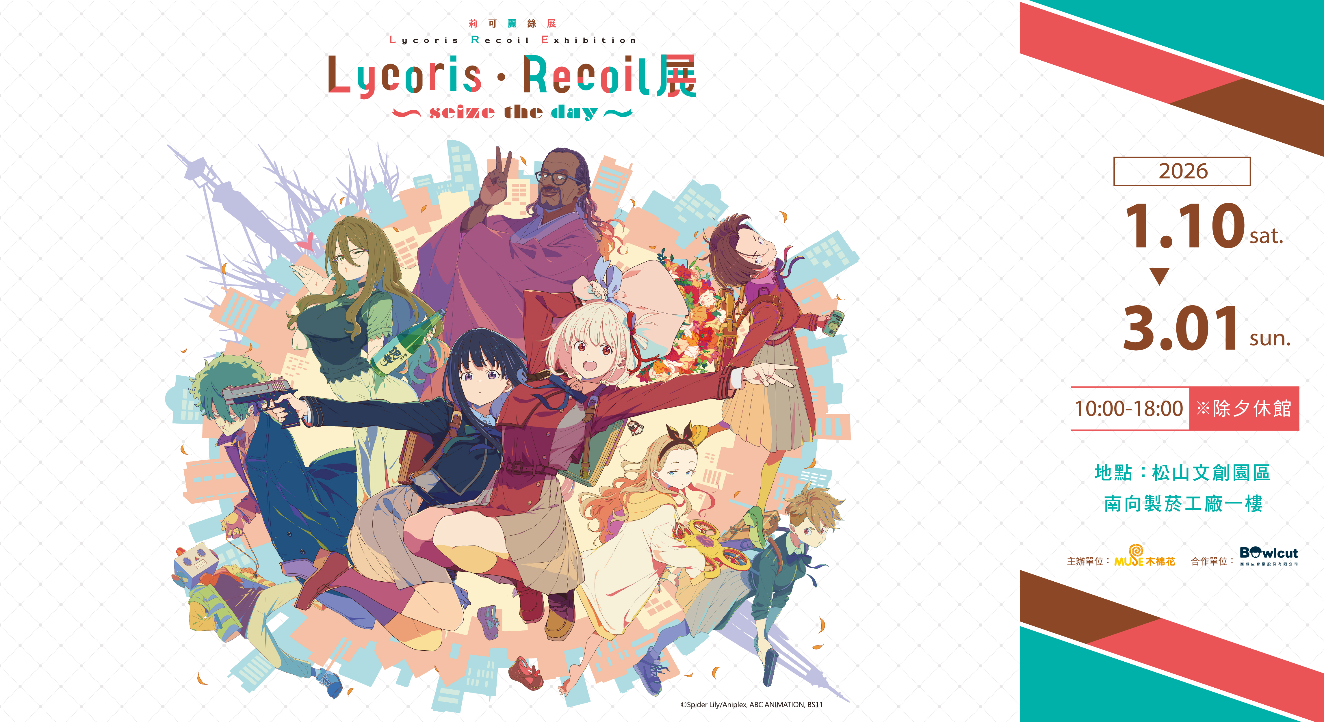 《Lycoris Recoil 莉可麗絲展~seize the day~》首次海外移展,台北站將於松山文創園區登場!本次展覽完整重現 LycoReco咖啡廳、水族館、DA總部等經典場景,並以沉浸式投影與立體造景,帶領觀眾走入千束與瀧奈的任務與日常。現場更展出原畫師、作畫監督等創作者繪製的精美簽名板。同時規劃台灣限定區、展期限定周邊,讓粉絲在收藏與體驗之間留下最完整的回憶。